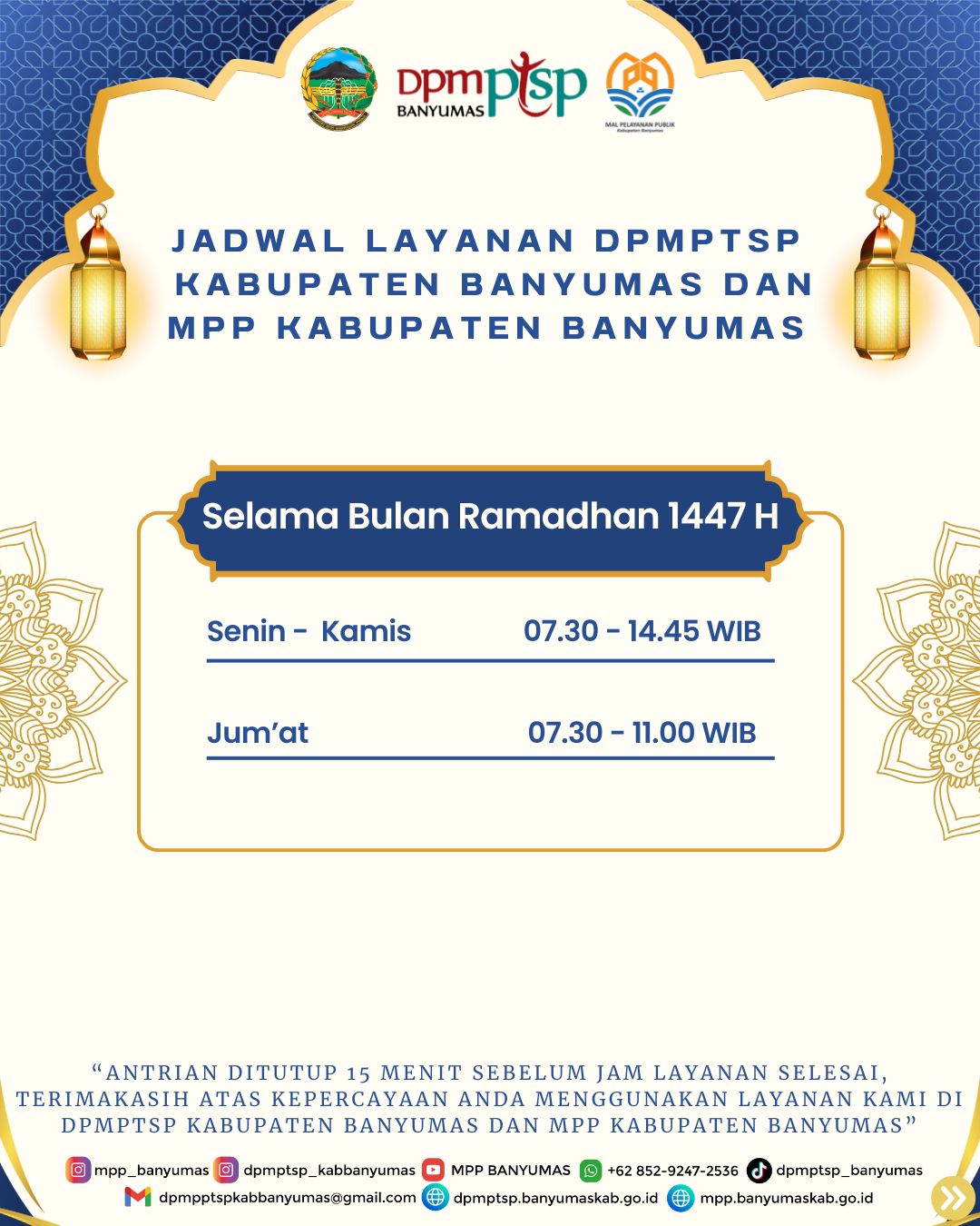 Halo Sobat MPP Banyumas. Dalam rangka menyambut bulan suci Ramadhan 1447 H, terdapat penyesuaian jam operasional pelayanan pada DPMPTSP Kabupaten Banyumas dan Mal Pelayanan Publik (MPP) Kabupaten Banyumas.