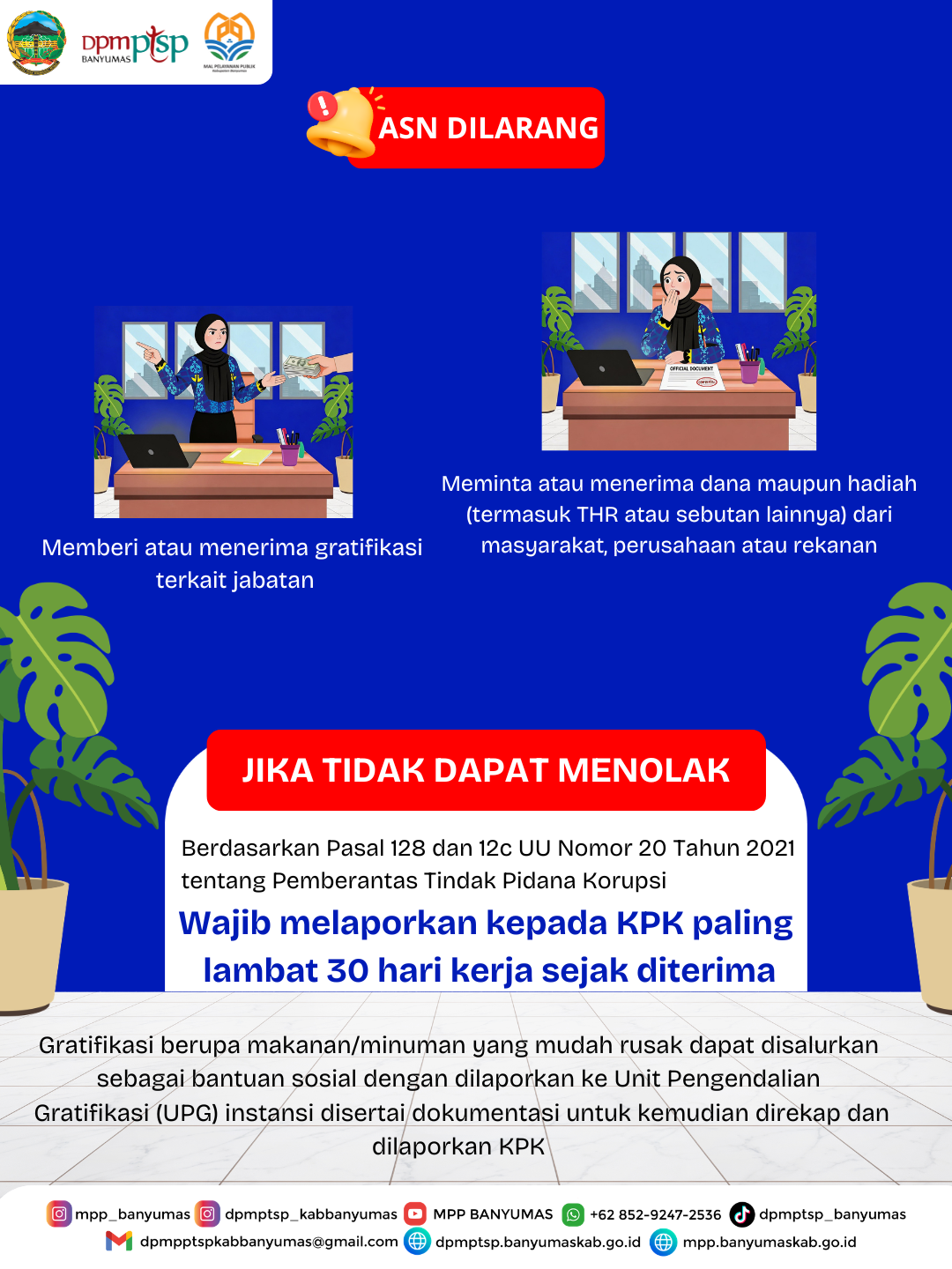 Sesuai dengan SE Nomor 100.3.4/6/2026 tentang Pencegahan Korupsi dan Pengendalian Gratifikasi terkait Hari Raya di Lingkungan Pemerintah Kabupaten Banyumas, kami berkomitmen untuk menjaga marwah ASN yang bersih dan melayani.